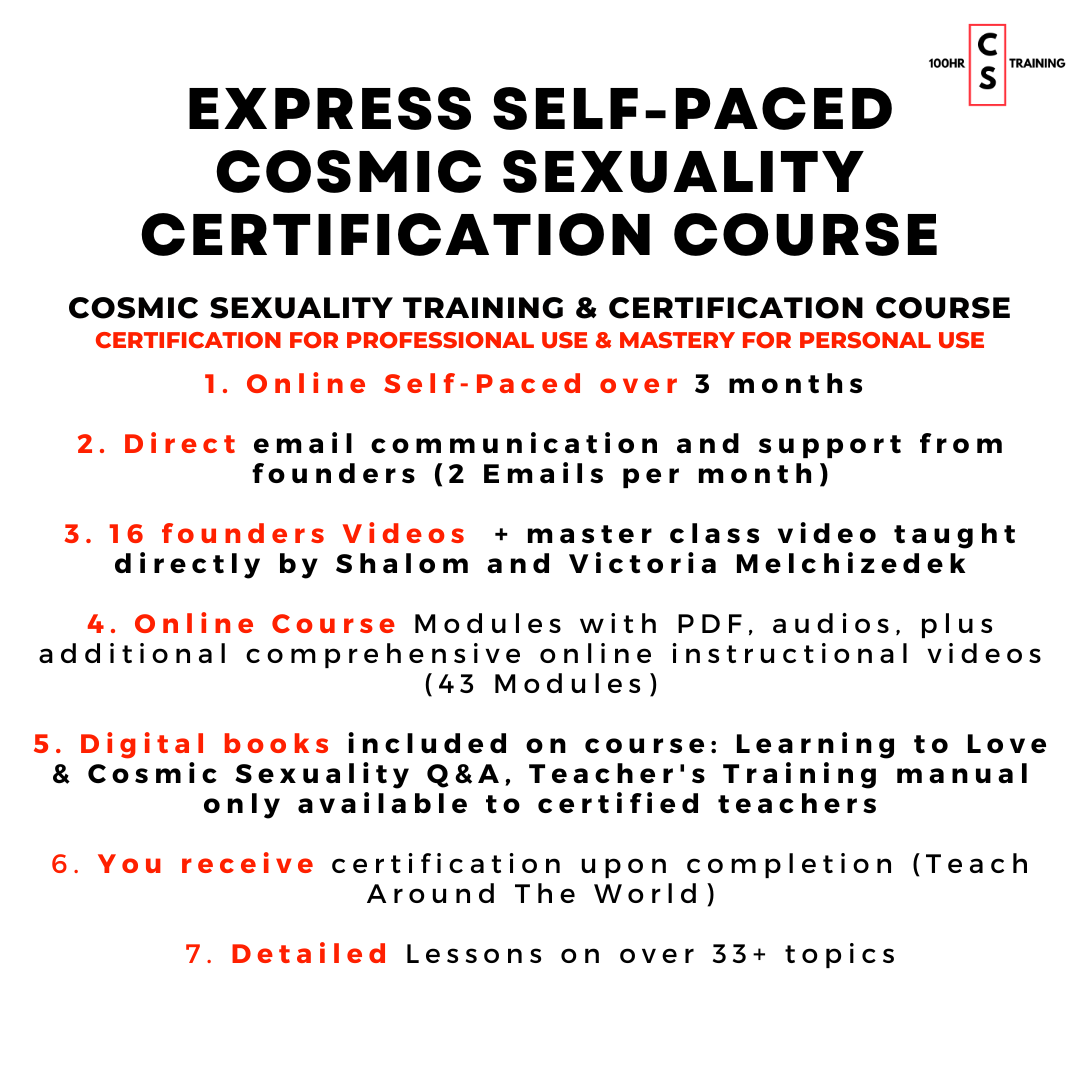 The 100 Hour Training Program, that equips you to share the lost ancient Cosmic Sexuality techniques, making you knowledgeable to teach and guide another.